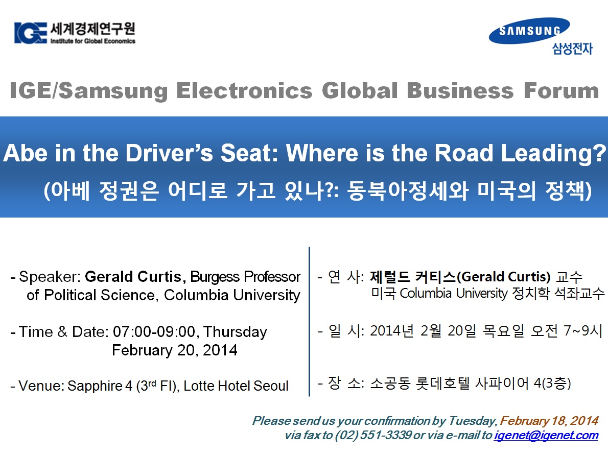 - Speaker: Gerald Curtis, Burgess Professor of Political Science, Columbia University- Date & Venue: 07:00–09:00, Thursday, February 20, 2014 // Sapphire 4 (3rd Fl), Lotte Hotel Seoul